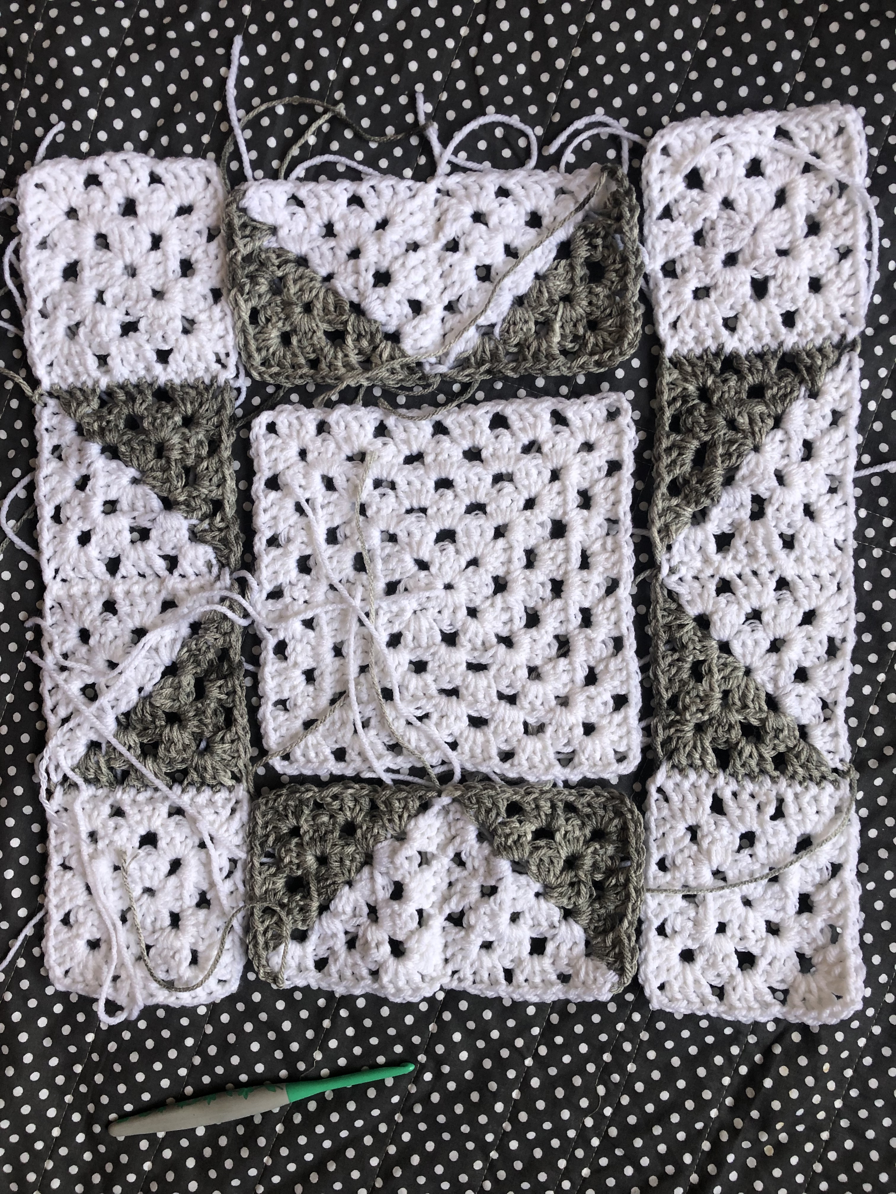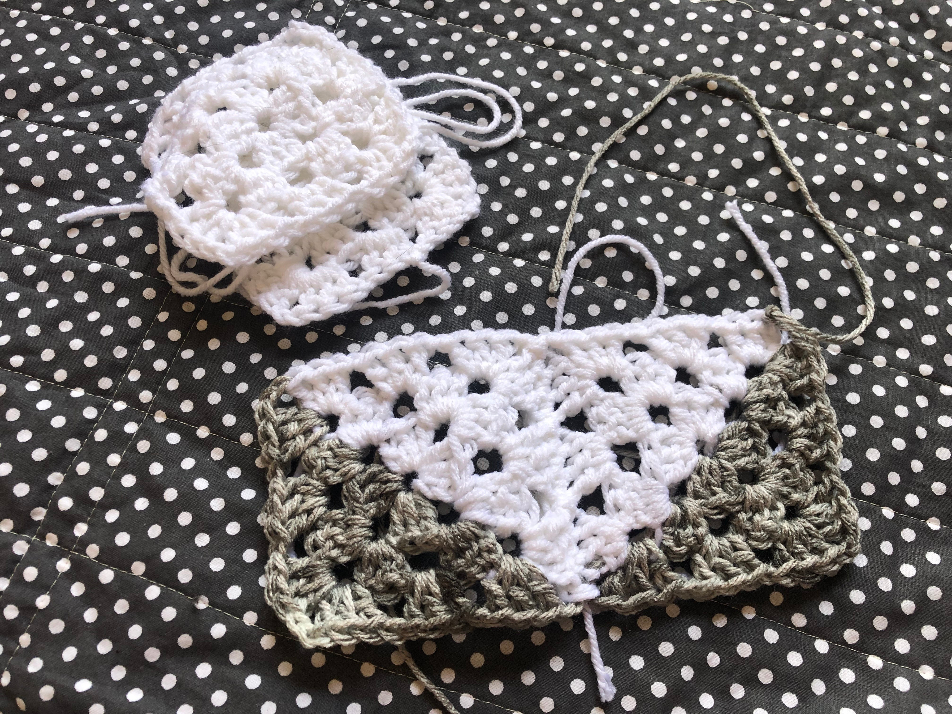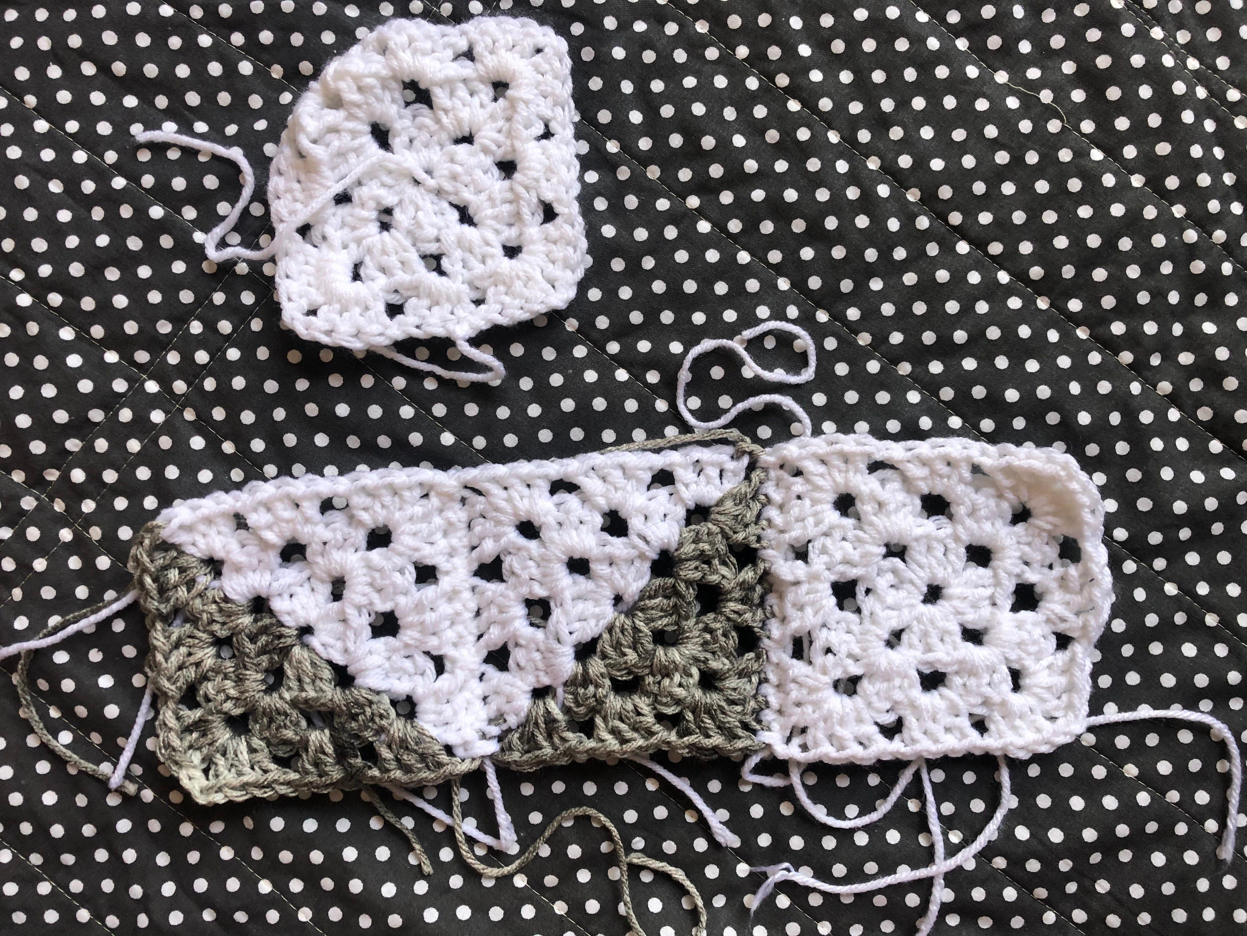 The challenge came in how to make the 2-color granny square. I’d seen a few solid version that looked like a half square triangle in quilting, but I wanted a classic granny look. After a test swatch or two – I managed it! Whew!