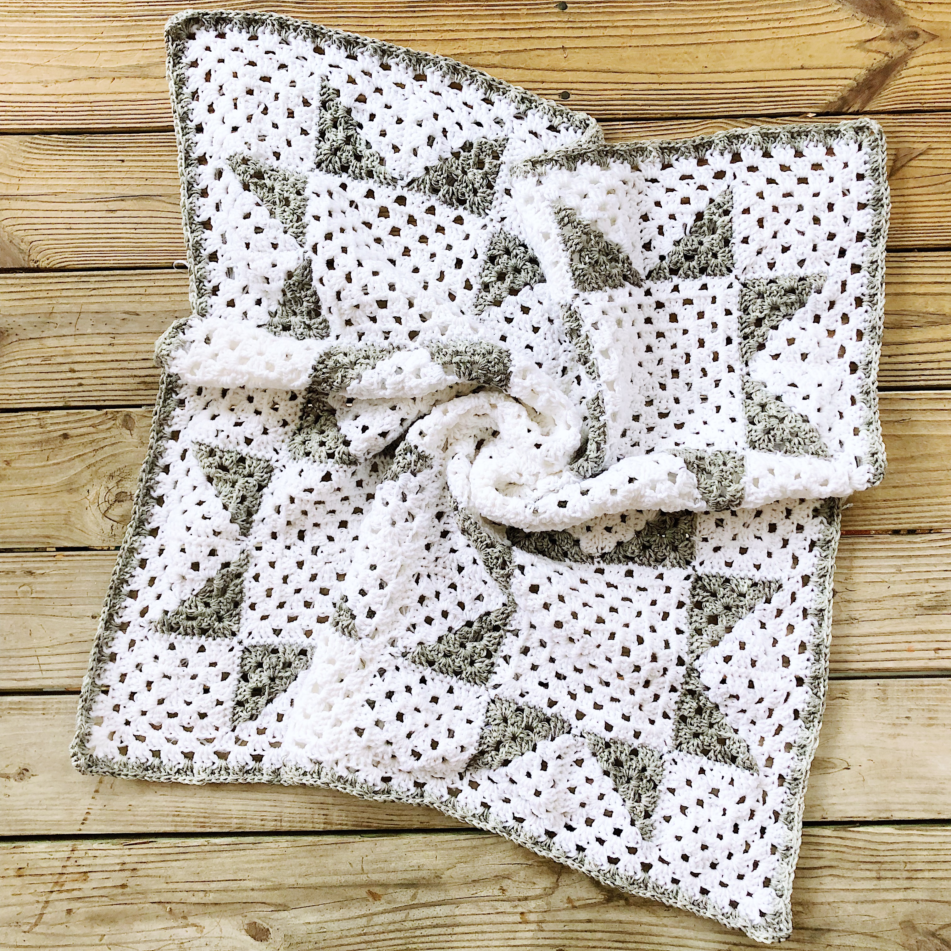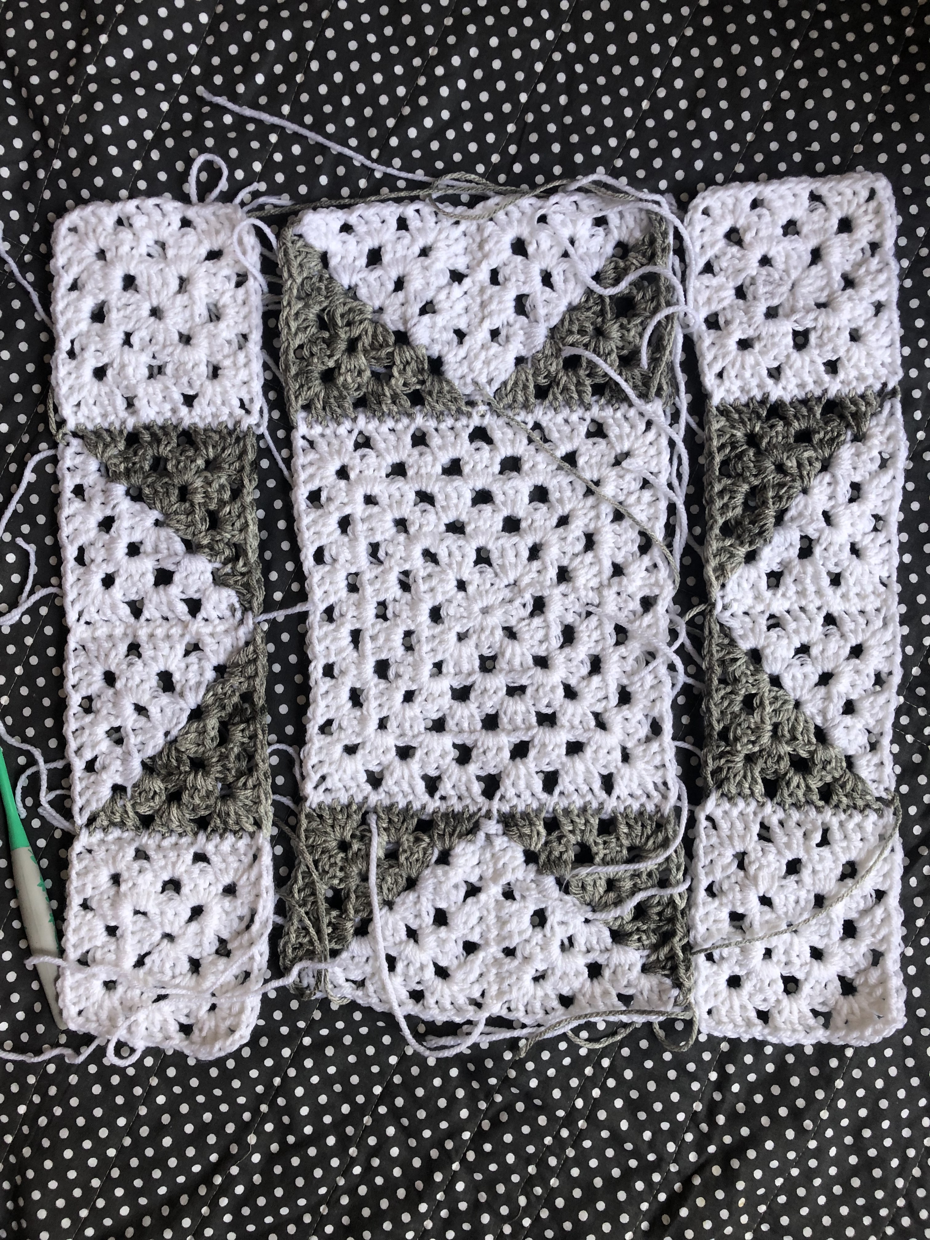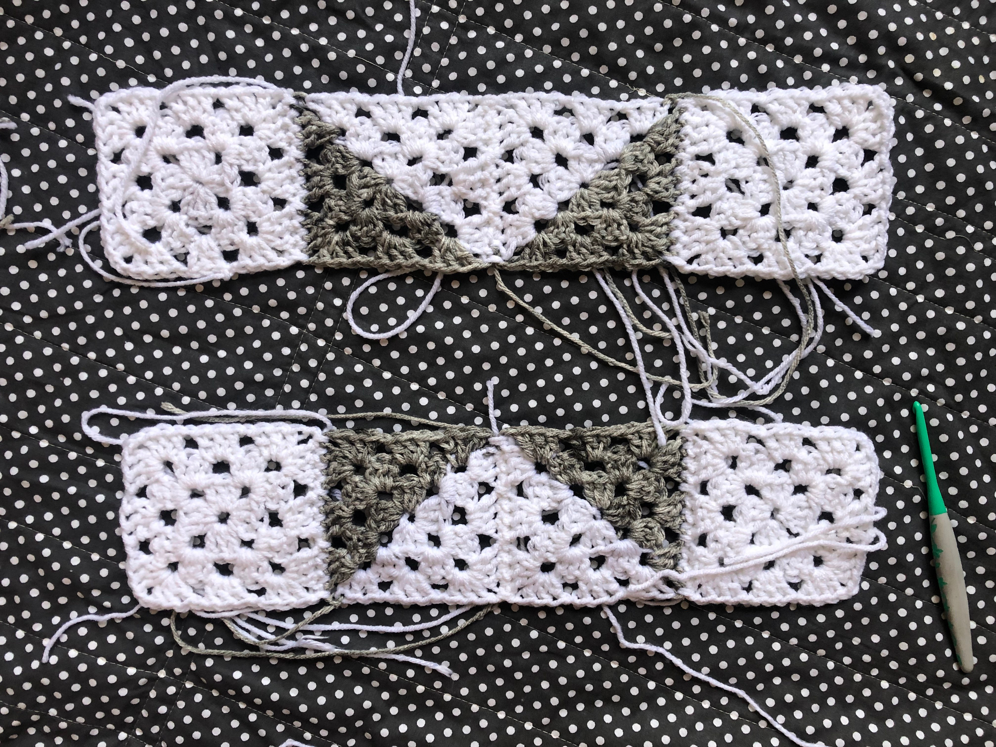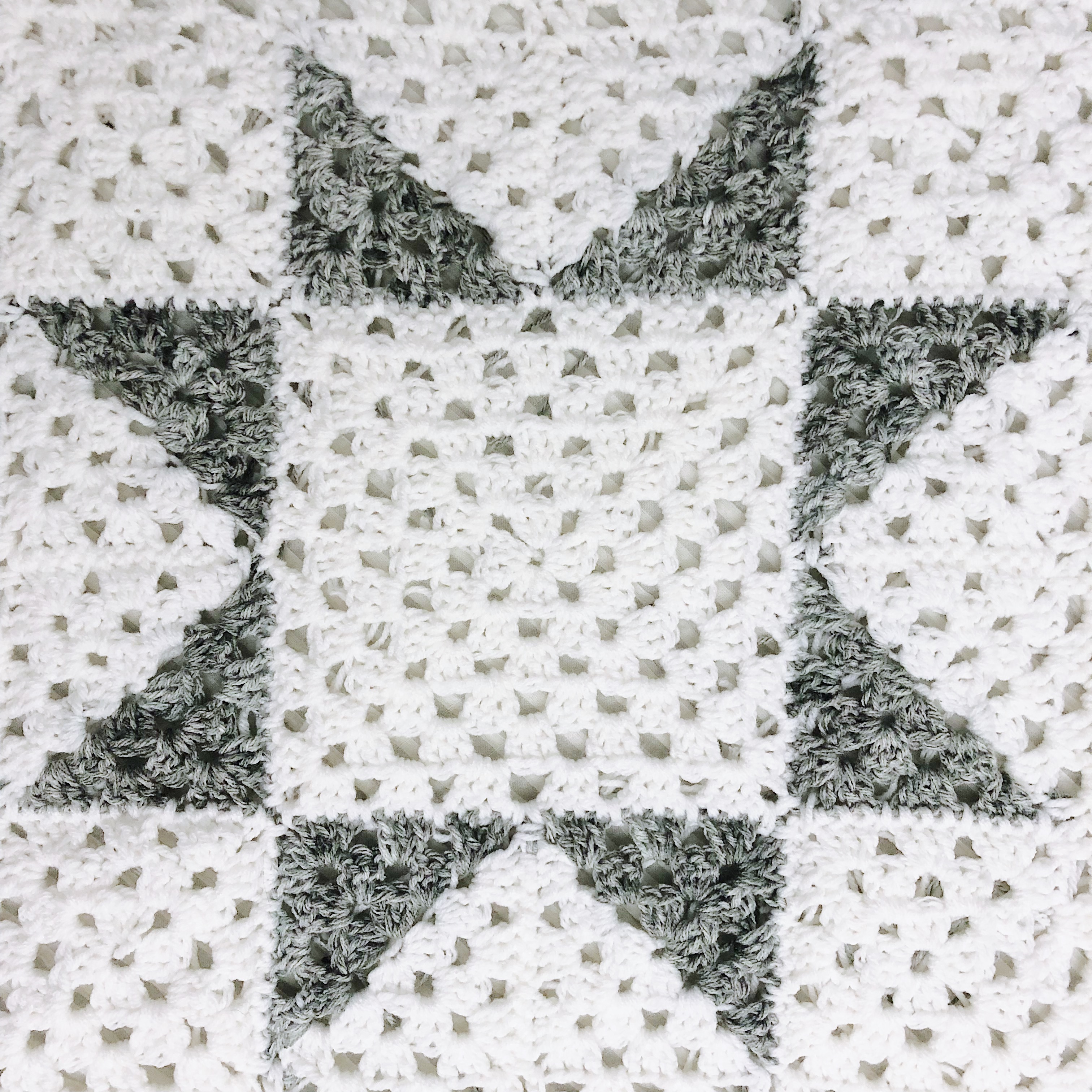 The challenge came in how to make the 2-color granny square. I’d seen a few solid version that looked like a half square triangle in quilting, but I wanted a classic granny look. After a test swatch or two – I managed it! Whew!