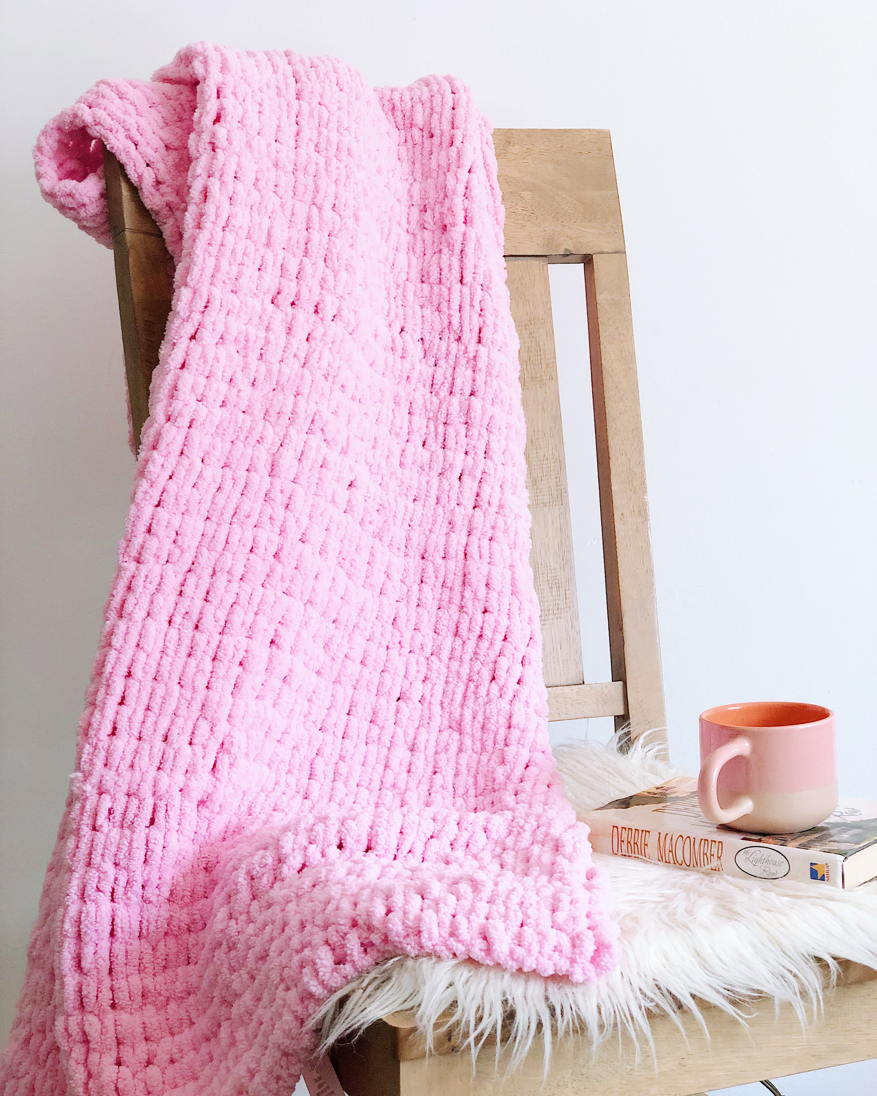 This throw blanket is easy as pie and even if you’ve never knit or crocheted a stitch in your life, you could work this up in no time flat.