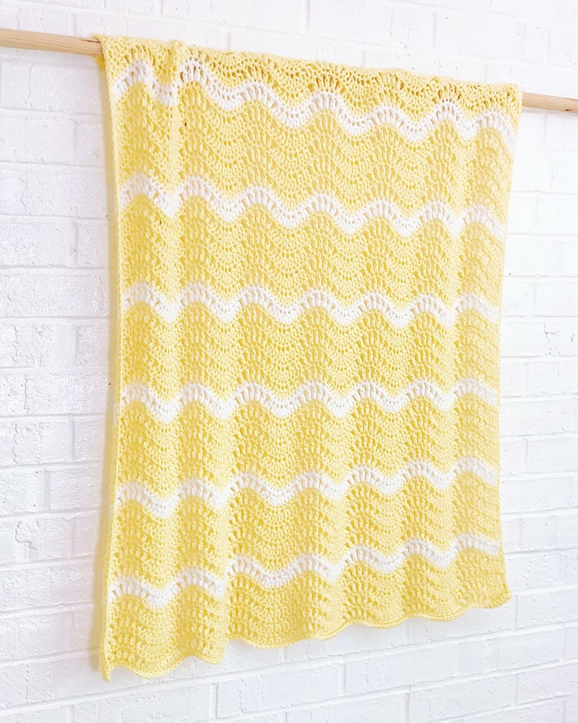 Today, I have a fun and super easy ripple blanket using one of my new fav acrylic yarns. It’s really quick to stitch (my fav kind of project) and it’s the perfect little blankie to work up in a weekend! The Lemondrop Chevron Afghan is just perfect!