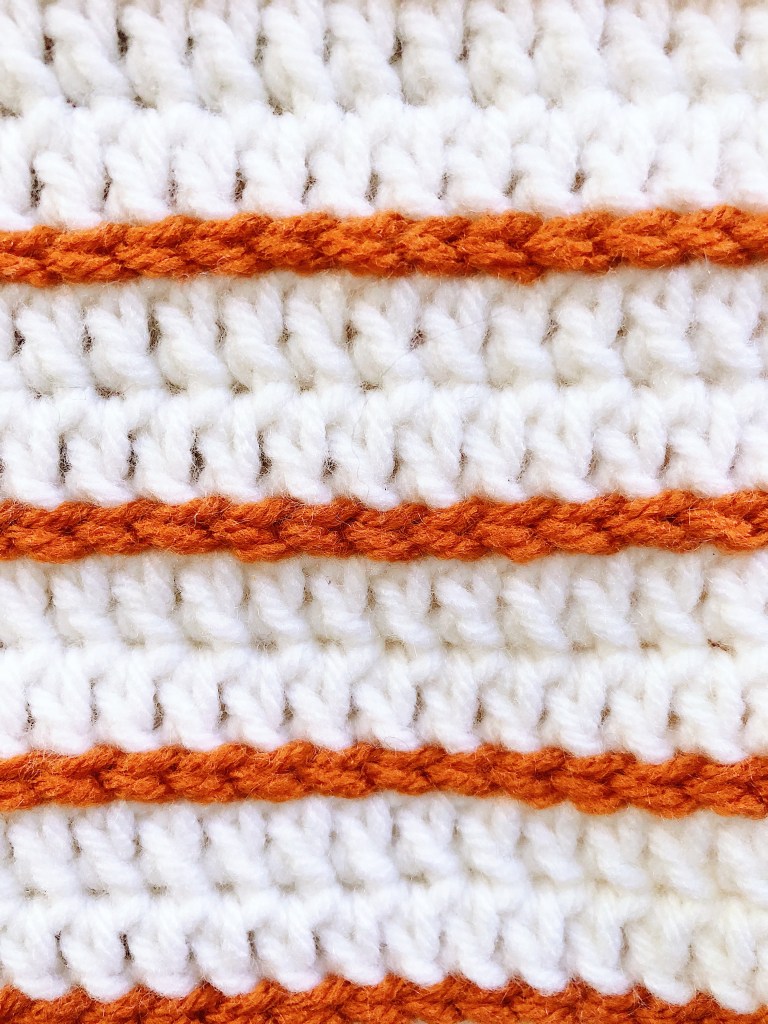 YES! These stripes are SO easy and SO fun to work. After you finish the sweater you’ll grab the contrast color of your choice (I went with a pumpkin orange cause its my fav right now) and slip stitch into each of the double crochet stitches around. It’s actually quite easy! You can find a great tutorial from my friends at The Crochet Crowd here!