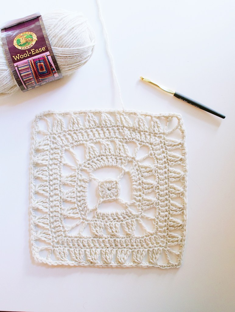 So excited to get started on the next Traveling Afghan Square! Oh, and what a beautiful pattern! I was a little lost in Rows of 4 and 6 and single crochet (sc) counts. I had to zoom in on your square image to see that there were 2 sc in the chain 2 spaces (Row 4) and 2 and 3 sc in the chain 2/3 spaces respectively. Nevertheless, after making five of these, I’ll be able to count them in my sleep. (I’m making 5 traveling afghans for gifts).Thanks for the journey of peaks and valleys.
